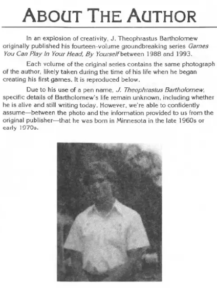 Et la suite du préambule explique comment nos auteurs ont découvert en 2014 plusieurs livres édités dans les années 80/90, intitulés « Games you can play in your head, by yourself « , d’un certain J. Theophrastus Bartholomew dans un vide grenier, totalement au hasard. Et que ces livres les ont fascinés pendant des années avant qu’ils décident de le diffuser à grande échelle dans un format raccourcis, compulsant les 10 jeux préférés de l’ancien éditeur.
